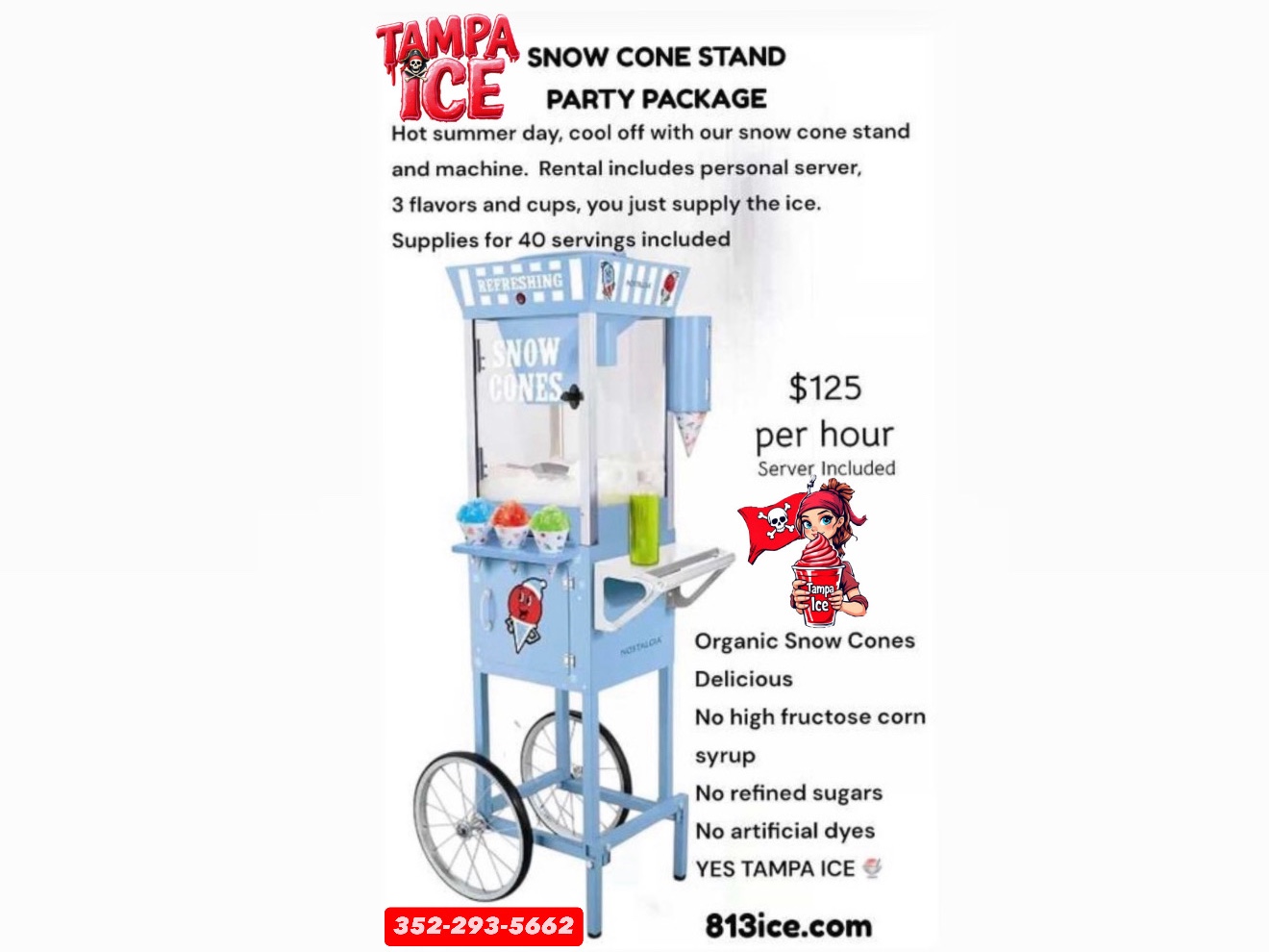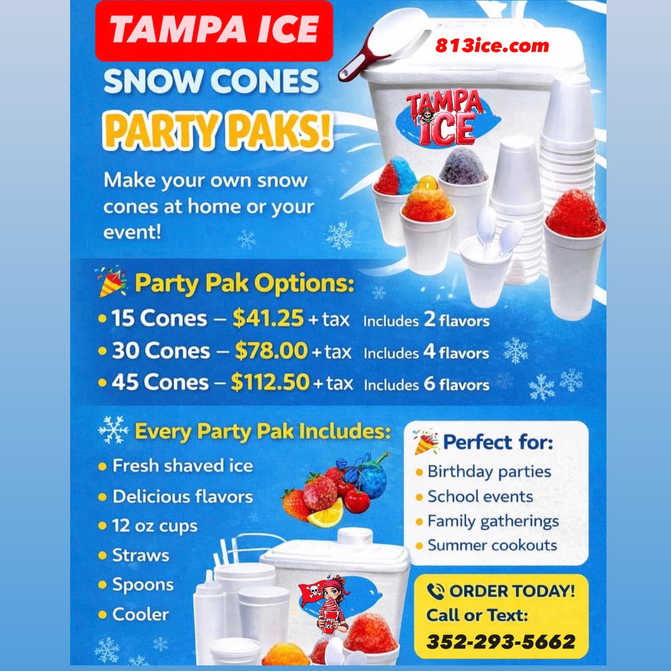 Experience the fun of snow cones at your next event with our mobile cart service or enjoy at home with our Party Pak options! Perfect for any occasion. Organic Snow Cones Delicious No high fructose corn syrup No refined sugars No artificial dyes YES TAMPA ICE 🍧